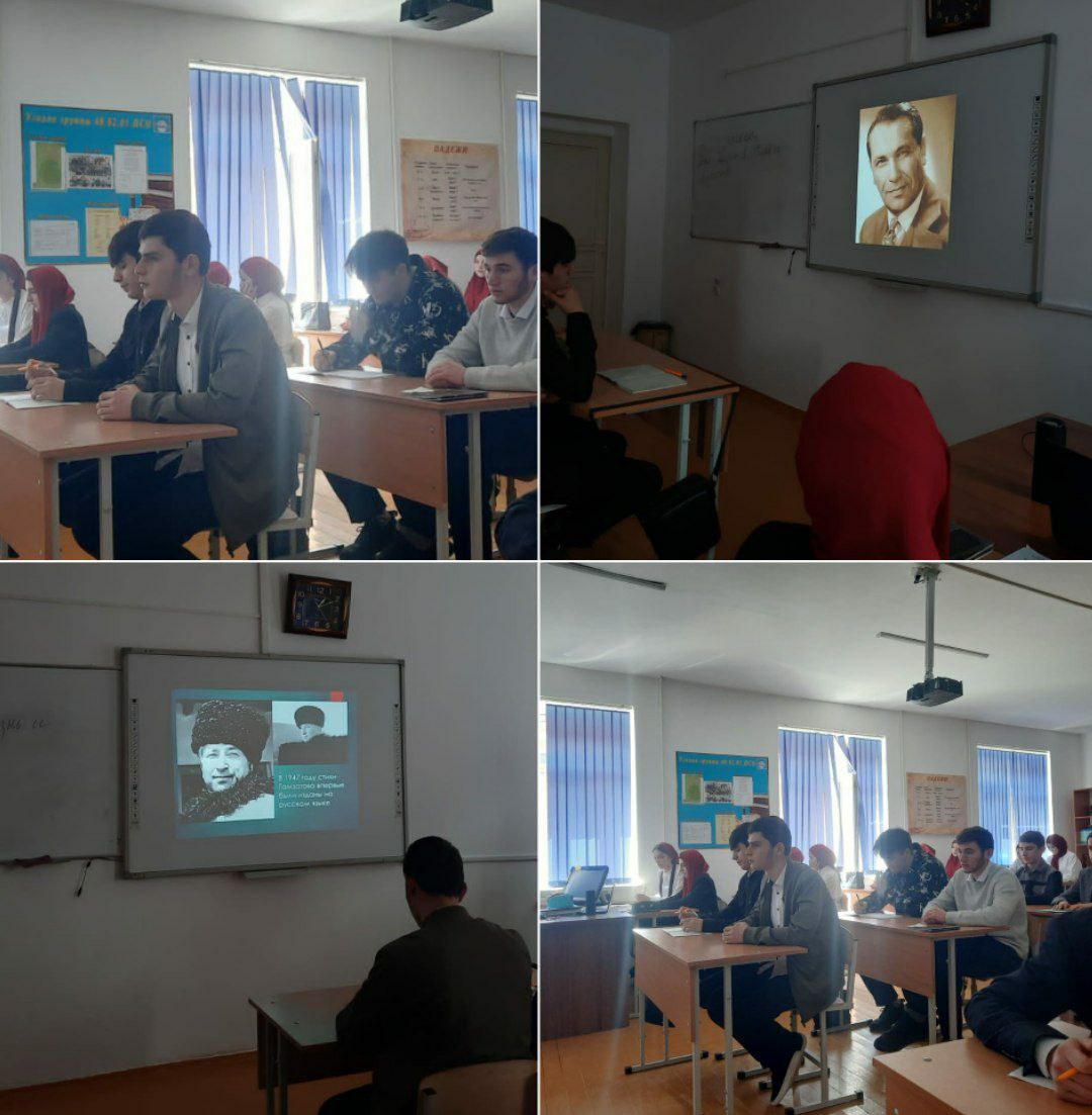 03.05.2023В нашем ГБПОУ "Ножай-Юртовский государственный техникум " познакомить студентов с жизнью и творчеством Р. Гамзатова; показать многообразие таланта великого поэта, привить любовь к Родине, матери, уважение к старшим и сверстникам на примерах произведений Р. Гамзатова; воспитание духовновно - нравственных качеств обучающихся был проведён урок: "Расул Гамзатов - лицо и голос Дагестана".
