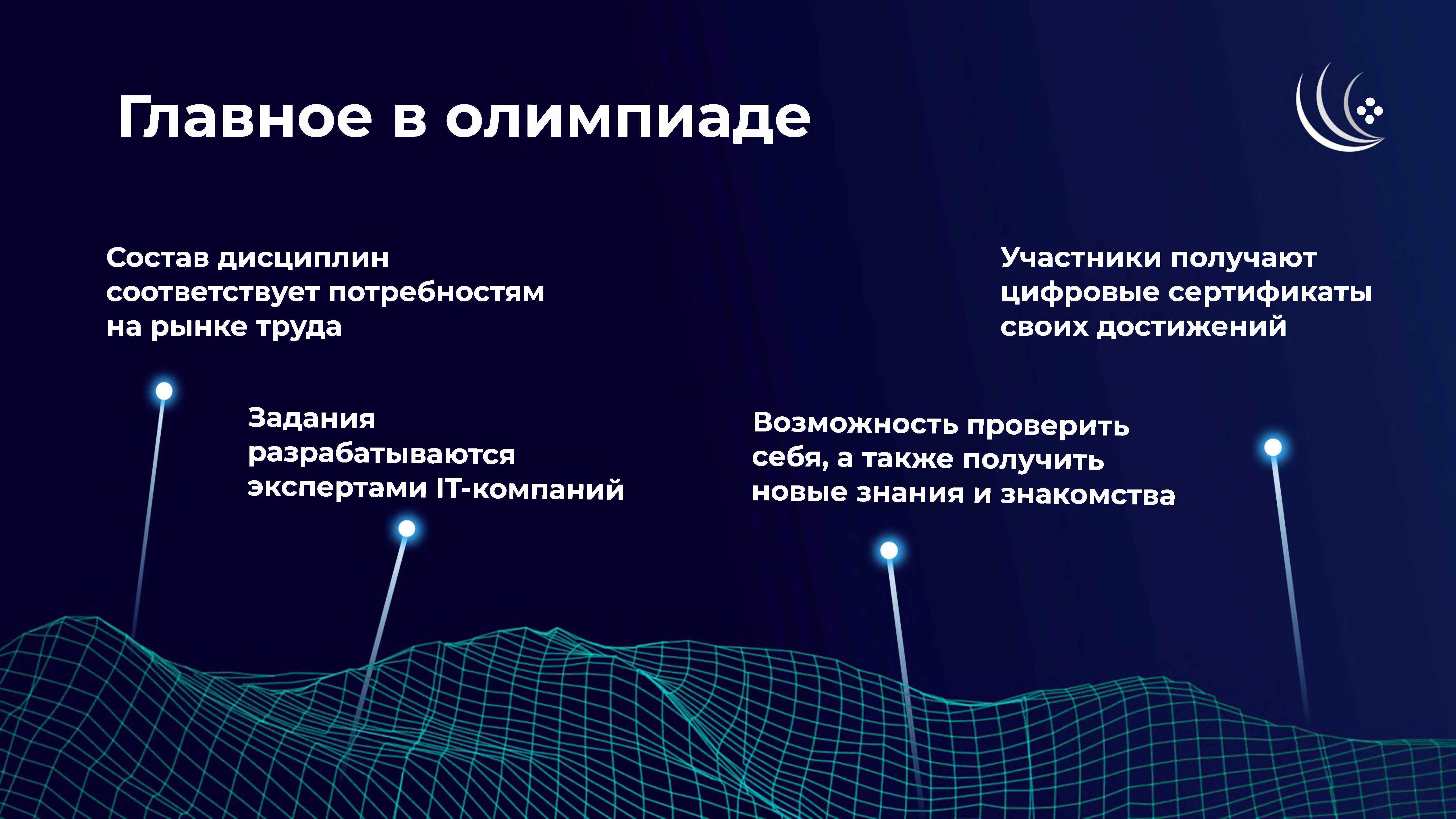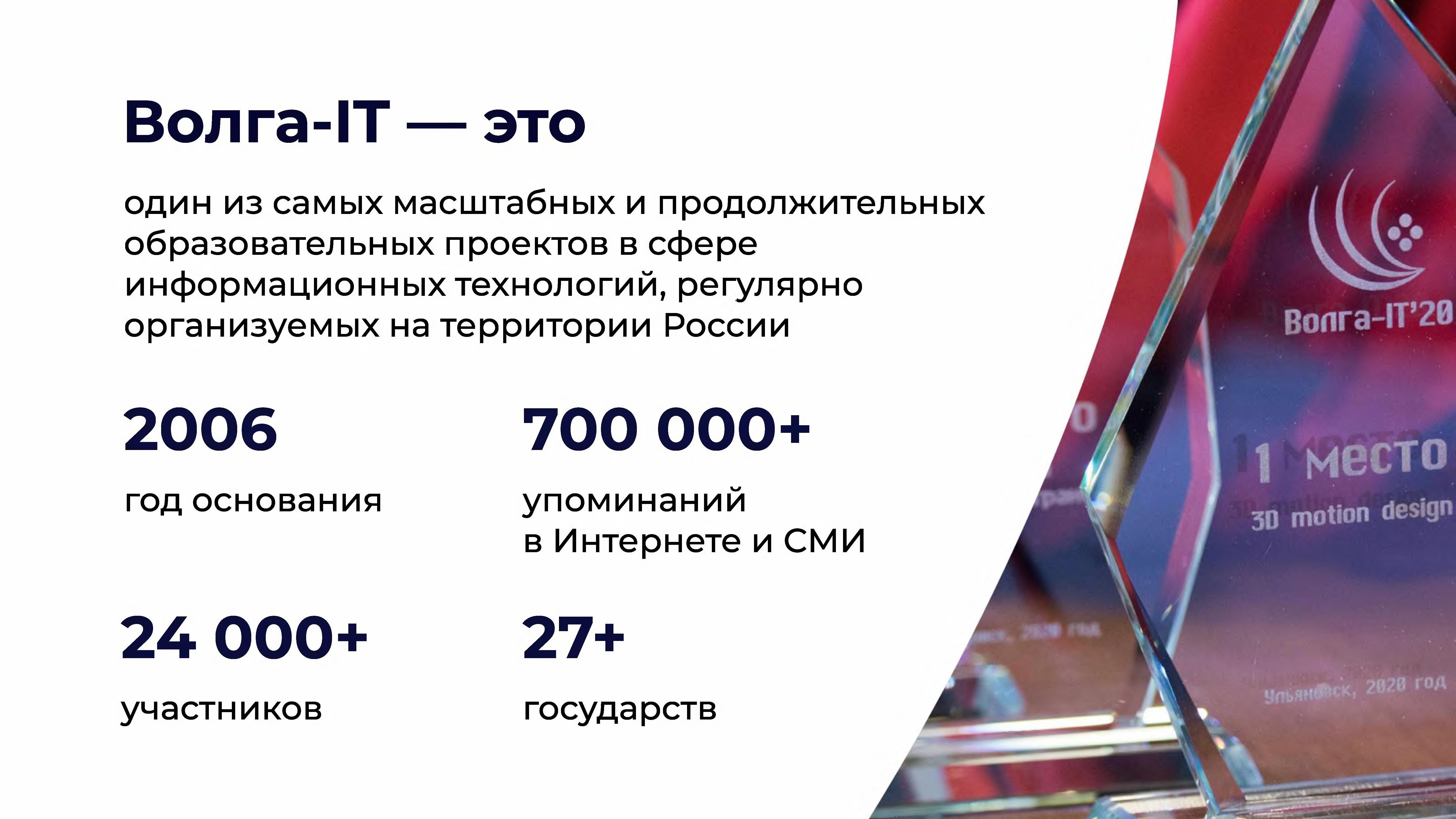 21.10.2024Ми и цифры России сообщает о проведении ежегодной Международнойцифровой олимпиады «Волга-IT» (далее - Олимпиада, «Волга-IT») для школьникови студентов.Организатором Олимпиады является Правительство Ульяновской области.«Волга-IT» проводится по актуальным направлениям информационных и цифровыхтехнологий. Учащиеся смогут проверить свои знания по семи дисциплинам:«Программирование на языке 1C», «Backend-разработка», «Web-дизайн»,«Автоматизация тестирования (Java)», «Искусственный интеллект и анализ данных»,«Мобильные приложения Flutter», «Телекоммуникации и информационнаябезопасность».В рамках «Волга-IT» участники смогут посетить образовательные вебинарыи мастер-классы от лидеров ИТ-отрасли. Участие в Олимпиаде является бесплатным.Регистрация на квалификационный и полуфинальный этапы продлитсядо 25 октября 2024 г. на официальном сайте Олимпиады по адресу в сети «Интернет»https://volga-it.org/. Финальный этап состоится с 25 по 29 ноября 2024 г. очнов городе Ульяновске.