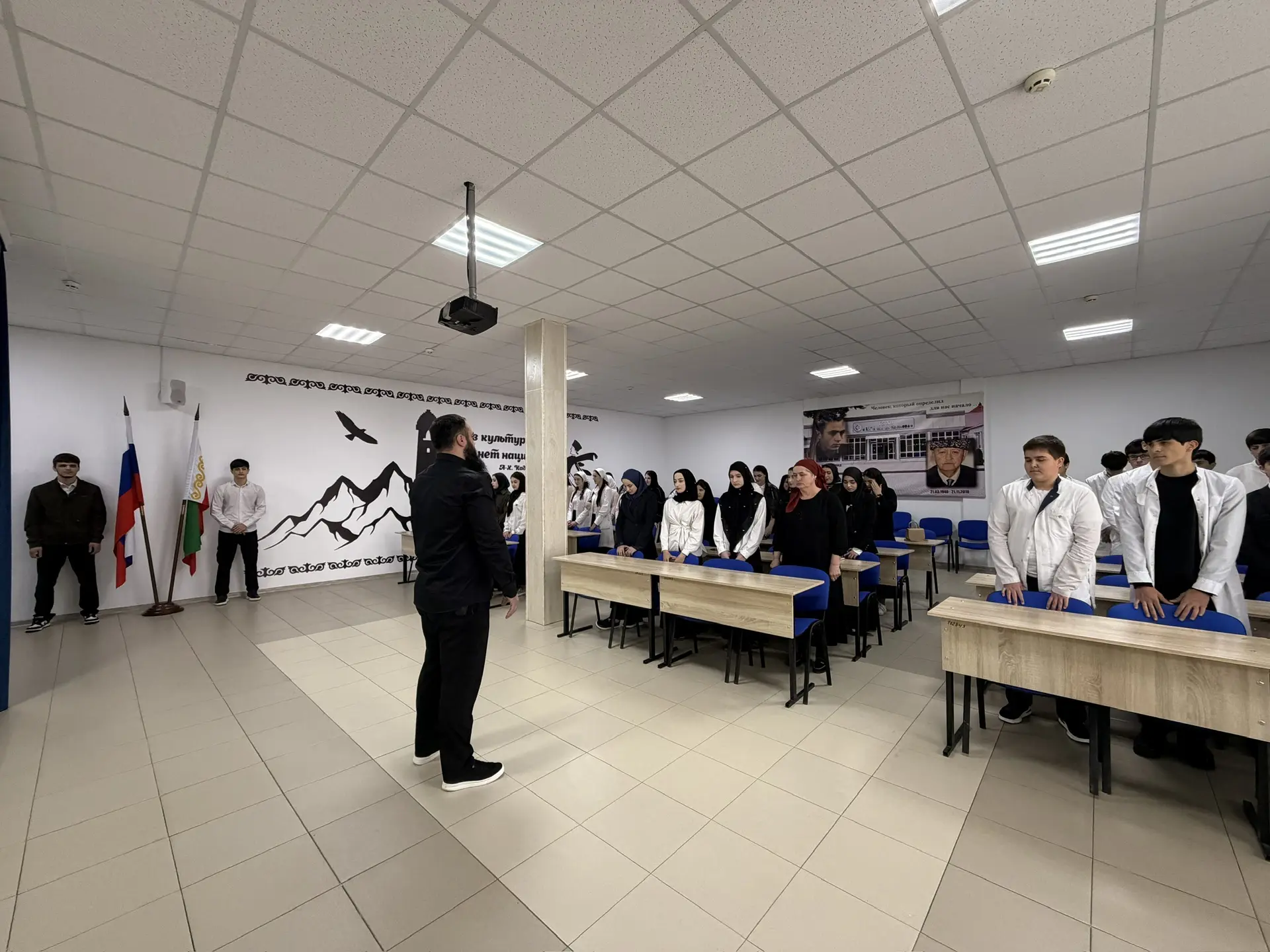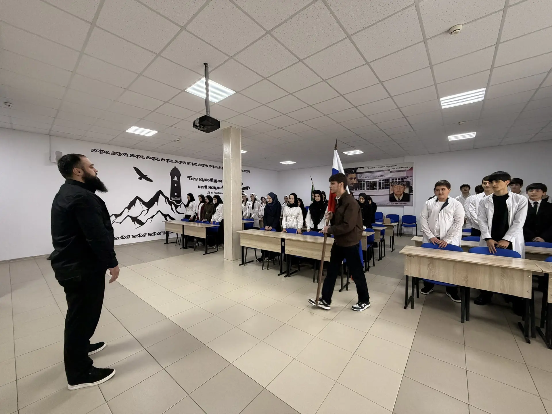 6 апреля 2026 года в ГБПОУ "КГК им. Ш. Калиева" утро началось с торжественной линейки в рамках еженедельной церемонии выноса Государственного флага Российской Федерации и флага Чеченской Республики.     Право выноса и установления флагов РФ и ЧР предоставили студентам 2 курса: Хусиханову Халиду и Ибриеву Абдурахману.После линейки студенты прошли в аудитории на внеурочное занятия из цикла «Разговоры о важном» на тему: «65 лет триумфа. Ко Дню космонавтики».